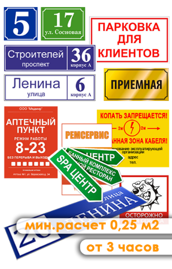 Максимальный размер таблички: 1,5 х 3 метра, минимальный: 10х10 см